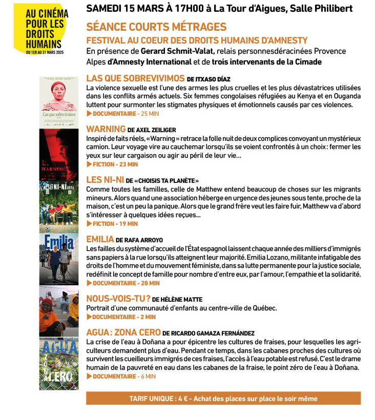 Le Groupe de Pertuis d’Amnesty International participe une nouvelle fois au Festival du Cinéma pour les Droits Humains. Il organise une soirée de projection de courts-métrages à La Tour d’Aigues le 15 mars.